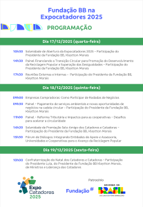 A atuação da Fundação Banco do Brasil com catadores é histórica e estratégica. A instituição apoia o setor por meio de projetos que estruturam cooperativas, ampliam a logística reversa e garantem inclusão socioprodutiva, como o Novo Cataforte, o Conexão Cidadã Pró-Catador e ações de reconstrução de unidades de triagem. Além disso, a Fundação é parceira da Expocatadores, reafirmando seu compromisso com a valorização dos catadores e com a construção de relações mais justas e sustentáveis na cadeia da reciclagem.